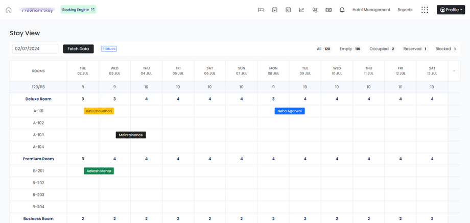 Color Codes: Uses colors to indicate different statuses (e.g., Check-in, check-out, reserve, under maintenance).